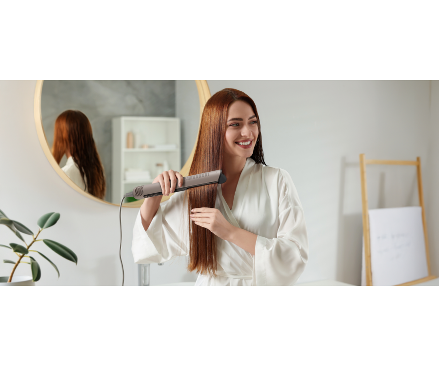 Фен-выпрямитель сочетает в себе передовые технологии укладки и бережного выпрямления волос. Мощный направленный поток создает зону низкого давления, мягко «затягивая» пряди в воздушную прослойку между пластинами. Волосы свободно парят в потоке нагретого воздуха, который ускоряет испарение влаги и одновременно разглаживает кутикулу за счет оптимального натяжения прядей. В отличие от обычных выпрямителей, фен бережно ухаживает за волосами, от корней до кончиков делая их гладкими и послушными, как после салонного ламинирования.